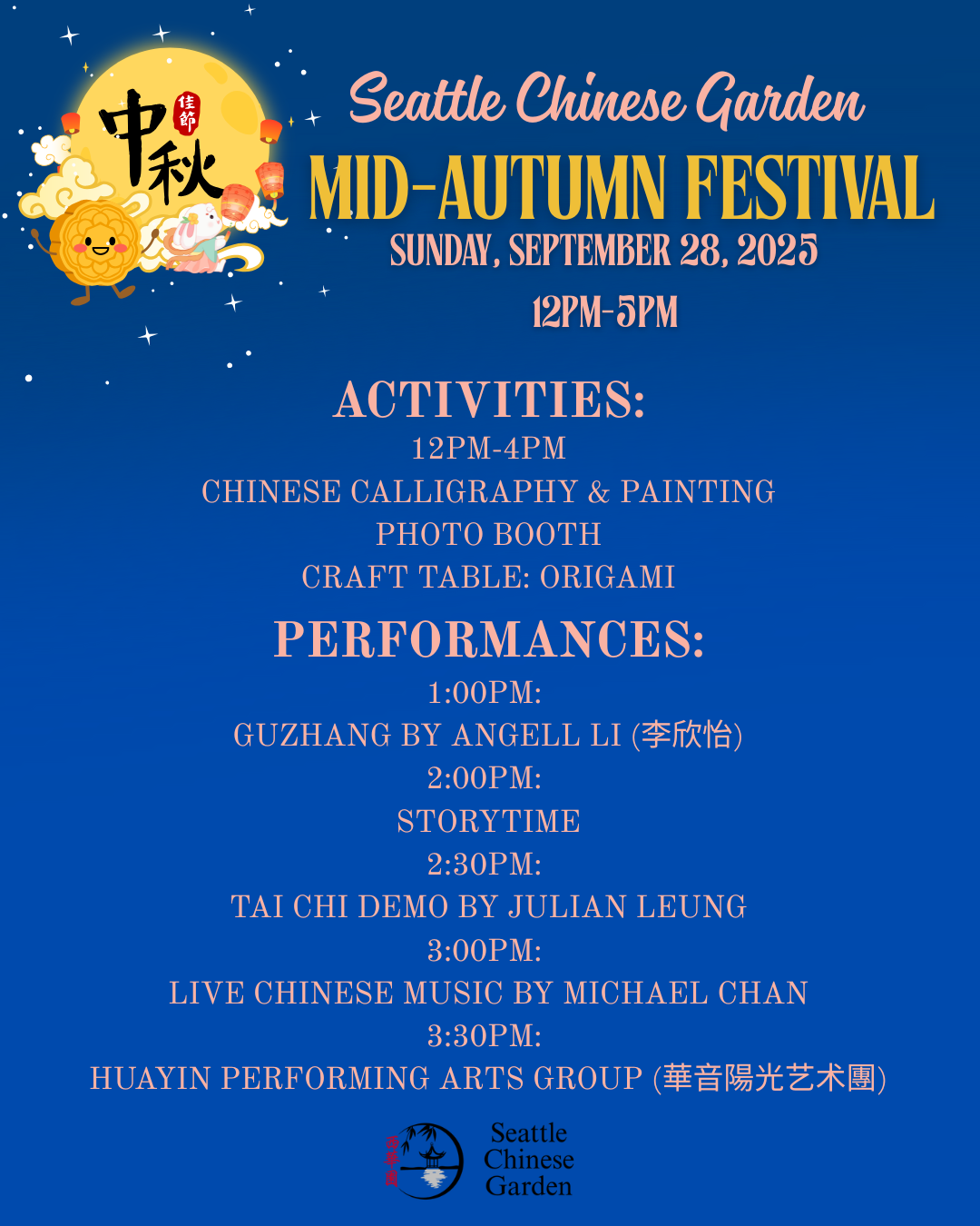 Join us on September 28th, from 12pm-5pm to celebrate the Mid-Autumn Festival! This event is an all-ages free event for the public, and parking will be free as well! See the flyer below for details about the program.