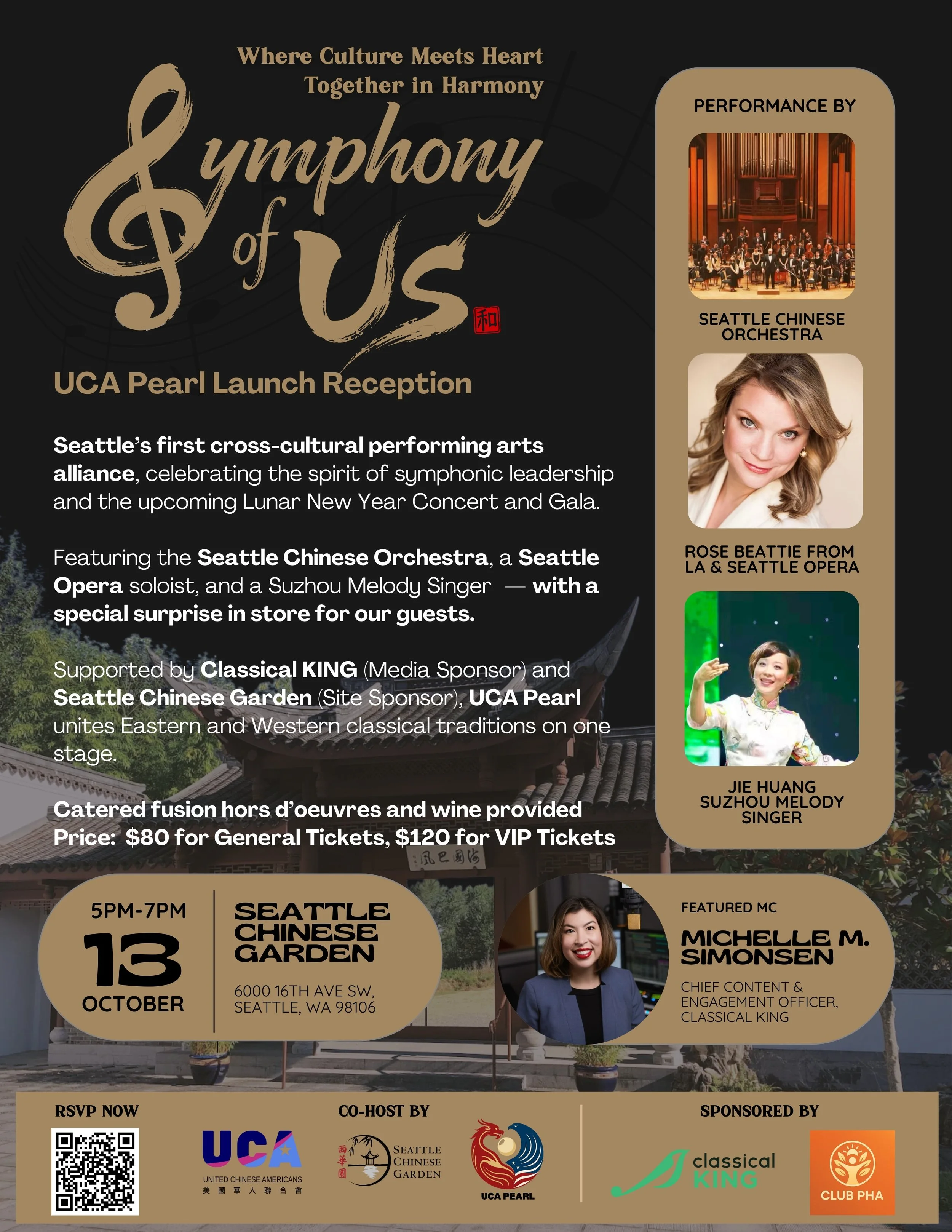 Join UCA Pearl and UCA on October 13, 2025 from 5pm-7pm to celebrate the launch of Seattle’s first cross-cultural performing arts alliance at a reception at the Seattle Chinese Garden! There will be musical performances by the Seattle Chinese Orchestra, the Seattle Opera, and a Suzhou Melody Singer. To purchase tickets, please click the button.